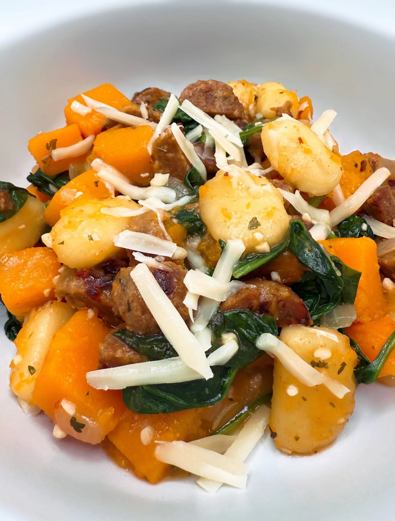 Each ingredient plays its part — the sausage brings savory depth, the butternut squash adds natural sweetness, and the gnocchi ties everything together with pillowy softness. A handful of spinach wilts into the mix for color and freshness, while a sprinkle of cheese finishes the dish with a touch of richness.
