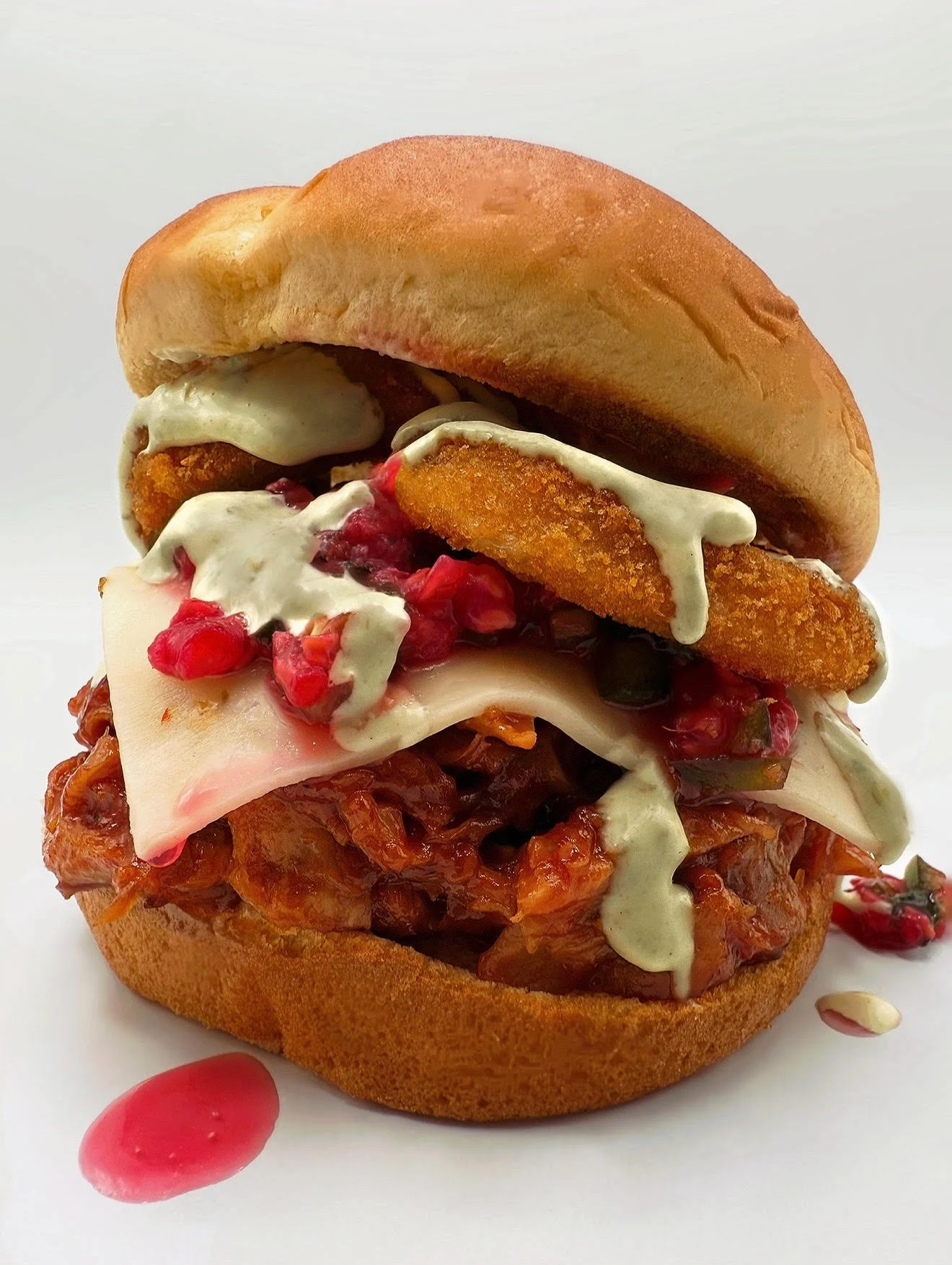 Every bite is a perfect balance of texture and flavor — tender barbecue pulled pork meets crunchy onion rings, creamy aioli, and a burst of freshness from the salsa. The melted pepper jack adds subtle heat, while the toasted bun holds everything together in one indulgent, unforgettable bite.